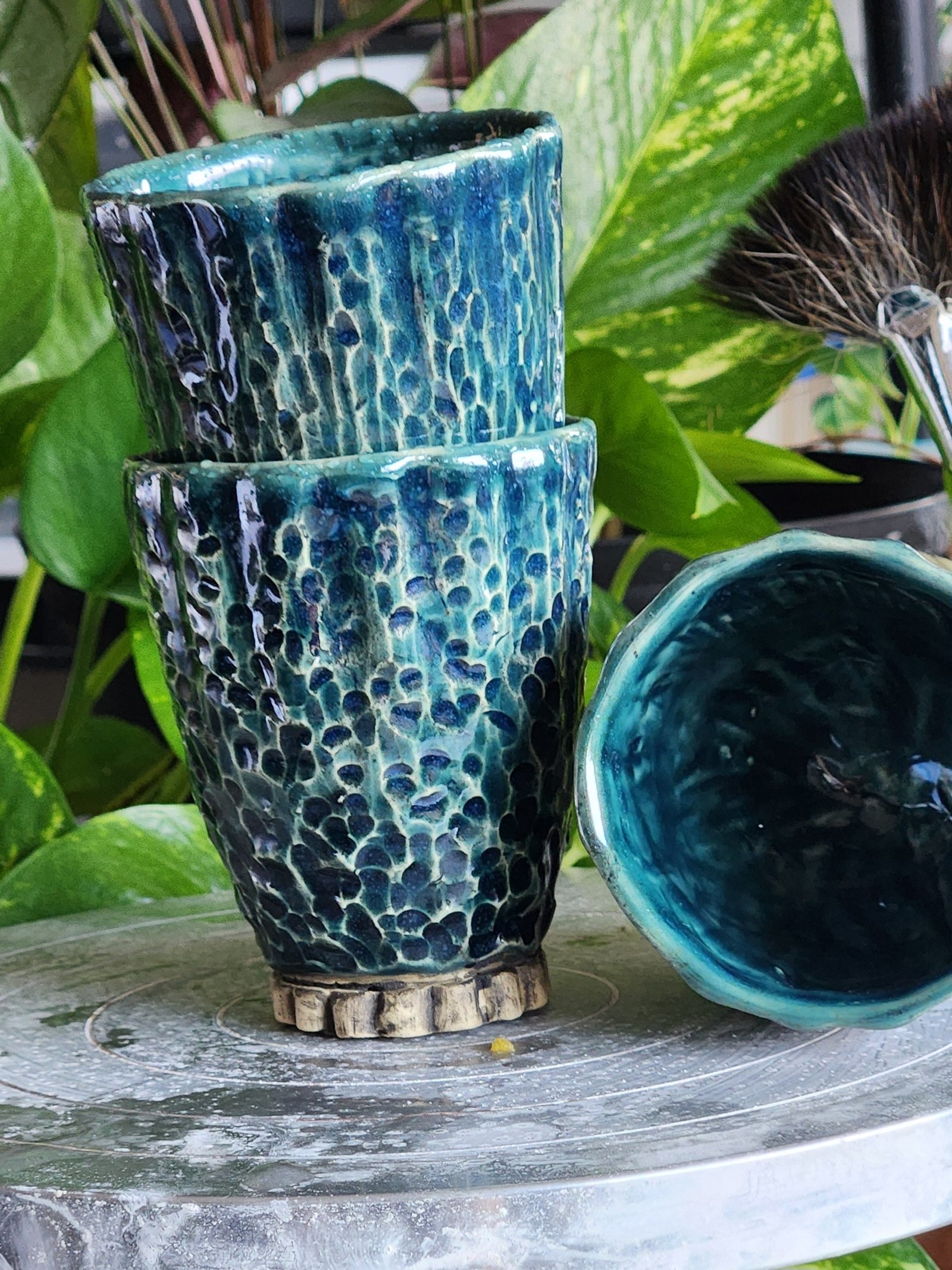 Elevate your daily ritual with these stunning, handcrafted ceramic tumblers. Featuring a unique, deep teal drip glaze over a heavily textured body, these cups are as beautiful as they are functional. Perfect for coffee, tea, or even a small dessert. Made with love in our home studio!